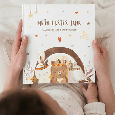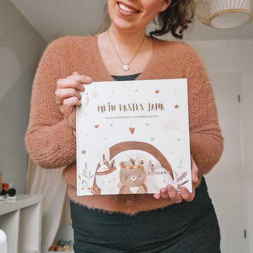 Mit hochwertigem Hardcover und handgemalten Waldtieren wird das Album selbst zu einem zeitlosen Erinnerungsschatz. Auf 92 liebevoll gestalteten Seiten hältst du die Entwicklung deines Babys fest – mit Platz für Fotos, Fuß- & Handabdrücke, monatliche Meilensteine, erste Worte, besondere Feste, Zahndiagramm und Stammbaum.
