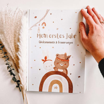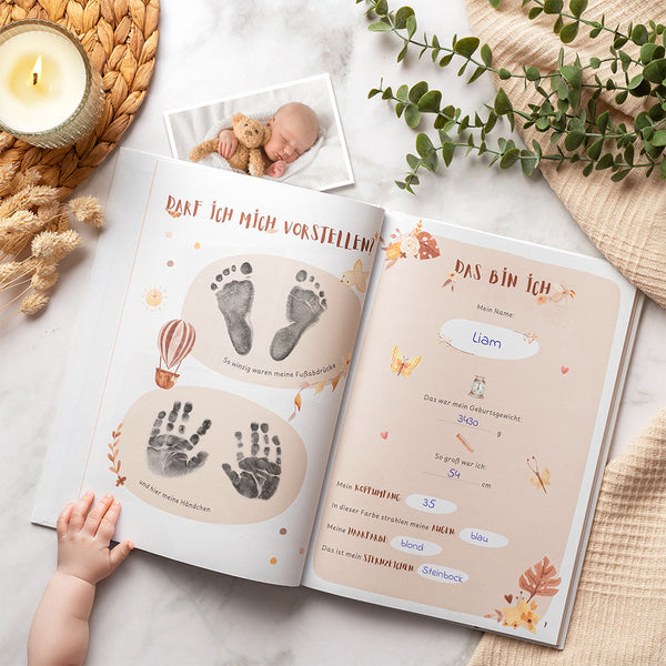 Mit hochwertigem Hardcover und handgemalten Waldtieren wird das Album selbst zu einem zeitlosen Erinnerungsschatz. Auf 84 liebevoll gestalteten Seiten hältst du die Entwicklung deines Babys fest – mit Platz für Fotos, Fuß- & Handabdrücke, monatliche Meilensteine, erste Worte, besondere Feste, Zahndiagramm und Stammbaum.