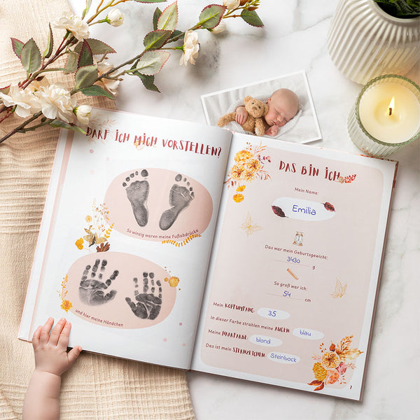 Mit robustem Hardcover und zeitlosem Rosaton mit floralen Illustrationen wird das Album selbst zu einem besonderen Erinnerungsschatz. Auf 84 liebevoll gestalteten Seiten hältst du die Entwicklung deines Babys fest – mit Platz für Fotos, Fuß- & Handabdrücke, monatliche Meilensteine, erste Worte, besondere Feste, Zahndiagramm und Stammbaum. Aus der Ich-Perspektive des Kindes entsteht so ein einzigartiges Erinnerungsstück, das euch auch Jahre später noch berührt.