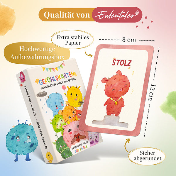 Das Set umfasst 44 kindgerecht illustrierte Karten. Jede Karte zeigt eine liebevolle Illustration auf der Vorderseite und eine kindgerechte Erklärung auf der Rückseite – ergänzt durch alltagsnahe Beispiele und einfühlsame Fragen, die zu wertvollen Gesprächen zwischen Kindern und Erwachsenen einladen. Deshalb werden die Gefühlskarten nicht nur in Familien, sondern auch von Erziehern und Lehrern gerne in Kitas und Schulen zur emotionalen Förderung eingesetzt.