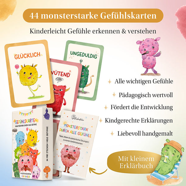 Ergänzt wird das Kartenset durch ein liebevoll gestaltetes Handbuch mit wertvollen Tipps, kreativen Spielideen und anschaulichen Erklärungen. Es zeigt dir, wie du deinem Kind spielerisch, mit Leichtigkeit und viel Freude den Umgang mit den unterschiedlichsten Gefühlen näherbringen kannst.