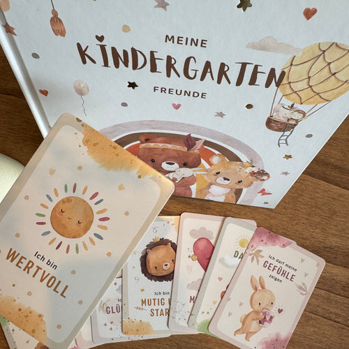 Im Set bekommst du unser Freundebuch mit süßen Tieren für die schönsten Kindergartenmomente und zusätzlich 44 Affirmationskarten, die dein Kind im Alltag stärken und begleiten.