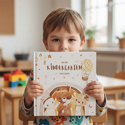 Ein besonderer Begleiter für neue Freundschaften – mit Platz für 25 Freunde und 6 Erzieherinnen. Edle Goldprägung, robustes Hardcover und handgemalte Waldtier-Illustrationen im sanften Boho-Stil machen jede Seite zu etwas Besonderem.