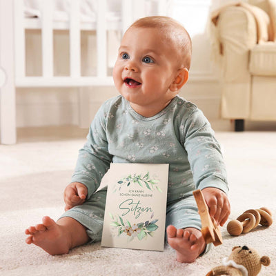 Lächelndes Baby sitzt auf dem Boden und hält eine Meilensteinkarte mit der Aufschrift "Ich kann schon ganz alleine sitzen".